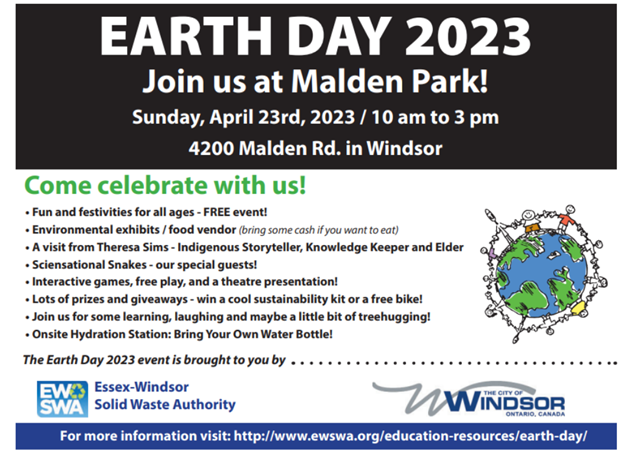 Windsor of Change at Earth Day Windsor Essex 2023 Sunday, April 23, 2023 10:00 AM 3:00 PM 10:00 15:00 4200 Malden Road Windsor, ON, N9C 3R1 Canada (map) Google Calendar ICS The City of Windsor is hosting an Earth Day event at Malden Park. Come chat with us at the Windsor of Change booth to participate in some fun Earth Day activities and learn more about our organization.